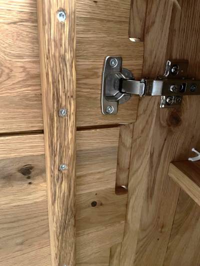 Die ausgearbeiteten Holzscharniere dienen zur Dekoration, funktional sind soft closed Metallscharniere verbaut.